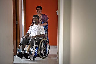 Heart transplant patient Kalaiselvan Kalian, 48, with his wife Parvathy Rajoo, 45, at their flat in Ang Mo Kio. He moves about in a motorised wheelchair when he ventures outside. -- ST PHOTO: DESMOND LIM