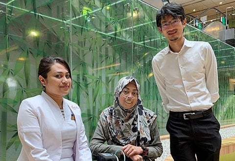 TERIMA BIMBINGAN RAWATAN TERAPI IV: Cik Haslina Wannor (tengah) mengendalikan rawatan terapi IV dengan bimbingan dan penjagaan pakar jururawat dari unit penjagaan pengkhususan kejururawatan NHCS, Cik Aidila Ismail (kiri) dan Profesor Madya Jonathan Yap (kanan), kededuanya dari pasukan Tekanan Darah Tinggi Pulmonari Pusat Jantung Nasional Singapura (NHCS). Gambar diambil sebelum tempoh pemutus litar. - Foto PUSAT JANTUNG NASIONAL SINGAPURA (NHCS)