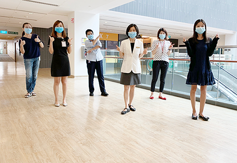 The superwomen of the NHCS contact tracing team: (L-R) Kym Ng, Office of Patient Experience; Tang Yi Wei, Human Resource; Lum Luh Na, CTRO; Haslinda Binte Hashim, Support Services; Wong Huay Lan, Finance; and Goh Pei Xuan, Cardiac Laboratory.