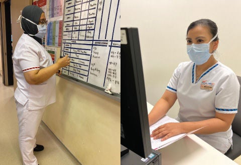 (L-R) During Ramadan, our Muslim colleagues carry on with their work as usual, with no changes to their daily routine – SEN Khabibah updating the list of doctors who are on-call; The staff respite room in Ward 56 offers a comfortable and quiet place for nurses to recharge.