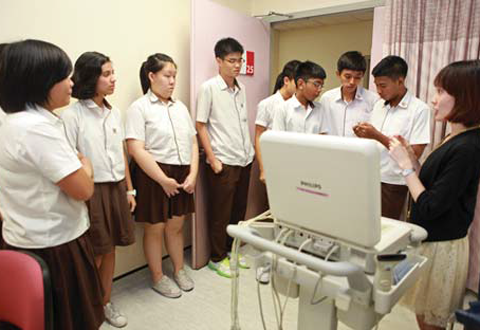 Poh Leng (extreme right) introduces an equipment to students on a visit to Cardiac Lab.